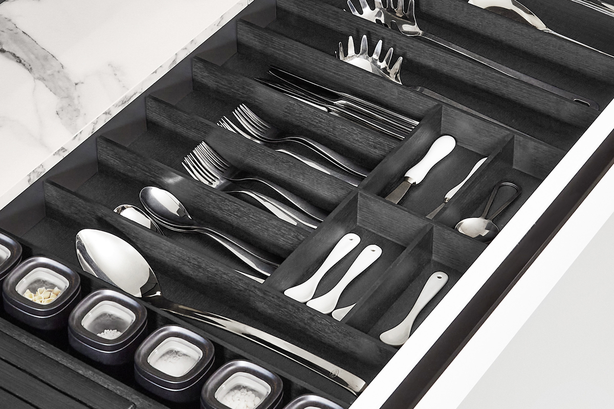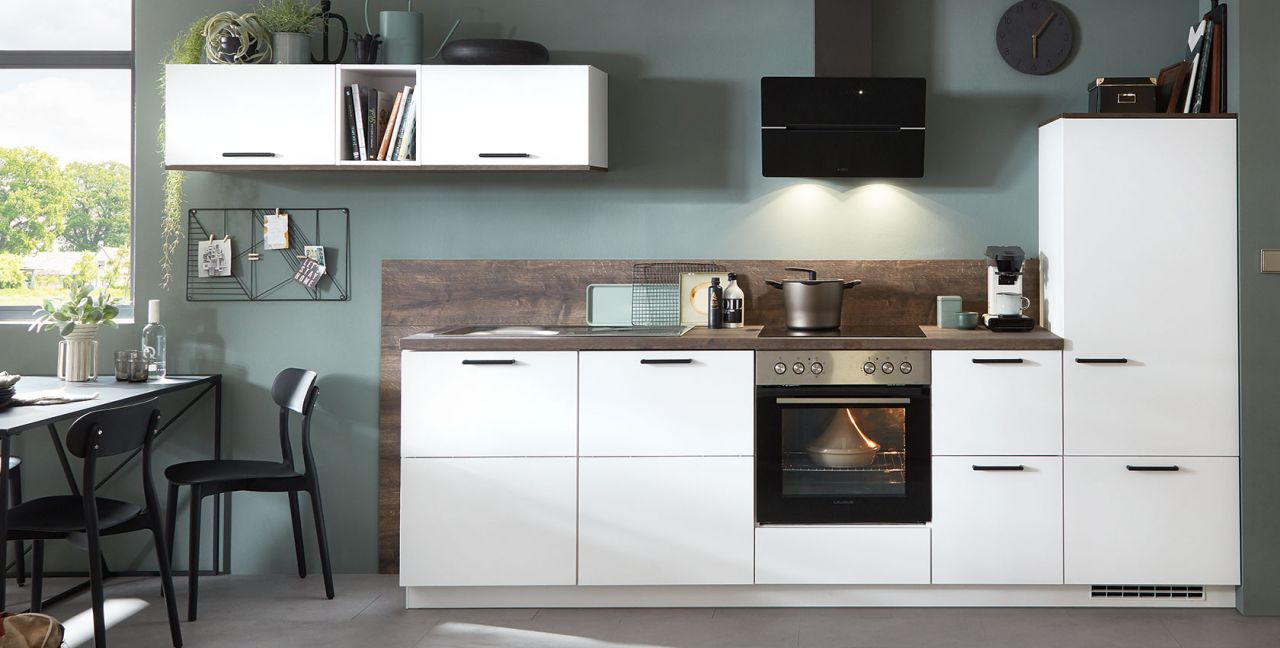 Inclusief RVS-inbouwoven Laurus LEH5 Energieklasse A, keramische kookplaat Laurus LCF600, designschouw RVS / glas Elica WISE60BK Energieklasse B, koelkast Laurus LKS122E Energieklasse E, RVS-inbouwspoelbak Rodi Okio Line 85 Deep, XL-kasten, onderkasten met grote laden, wandkasten met klapdeur, wand-schappenkast.