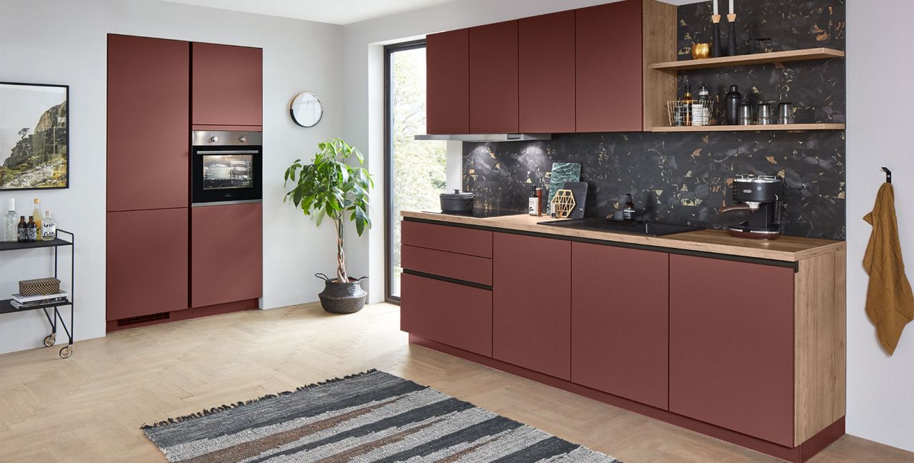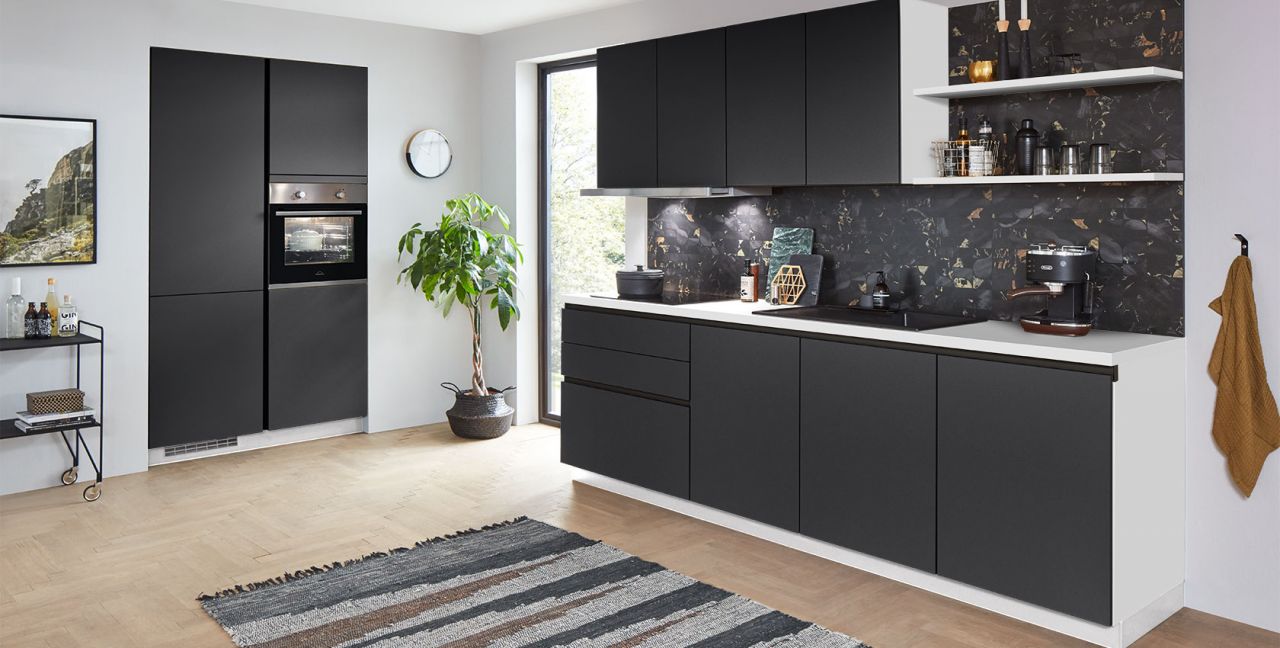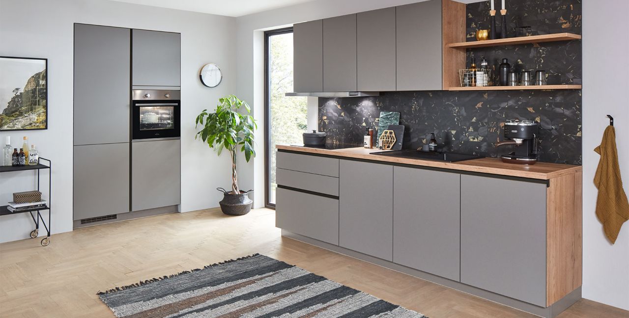 Inclusief RVS-inbouwoven Progress PBN13002X Energieklasse A, keramische kookplaat Progress PAS6001E, platte afzuigkap Progress PDP9040E Energieklasse A, koelkast Progress PK1215 Energieklasse E, inbouw-designspoelbak Elleci Logik 300, XL-kasten, onderkast met uittrekinterieur, wandborden.