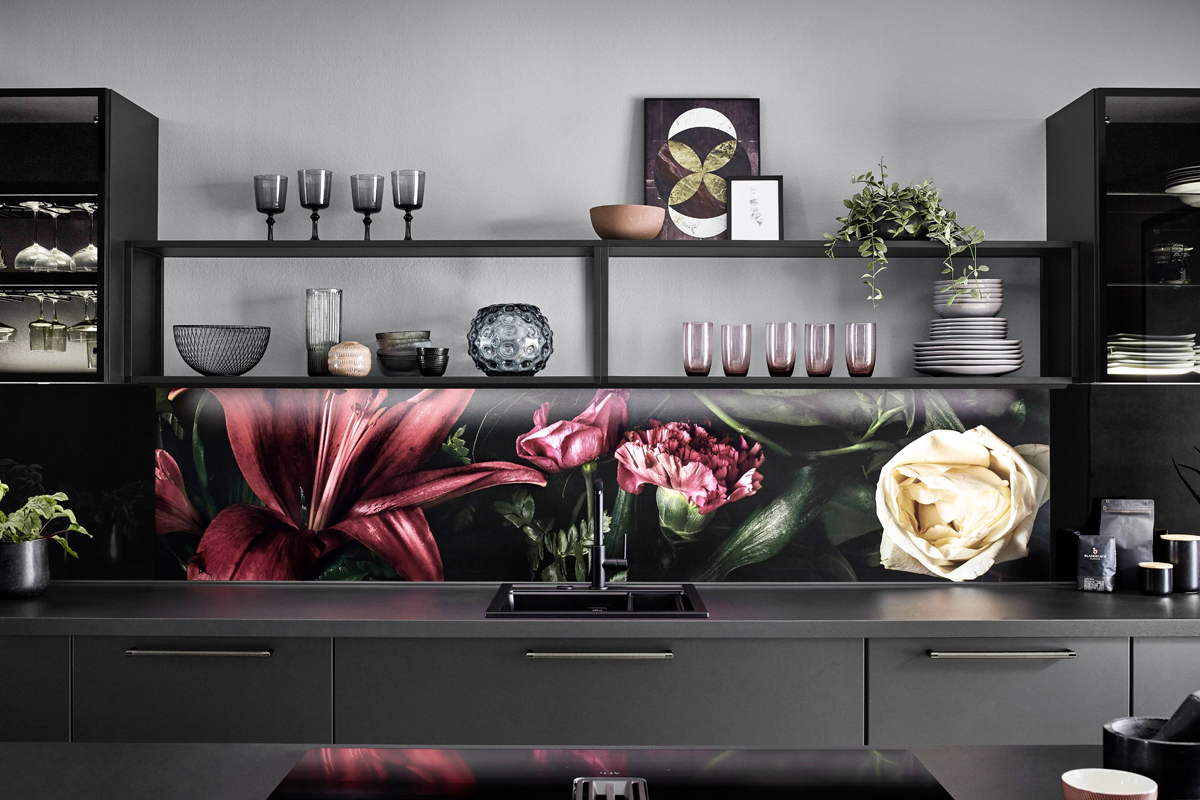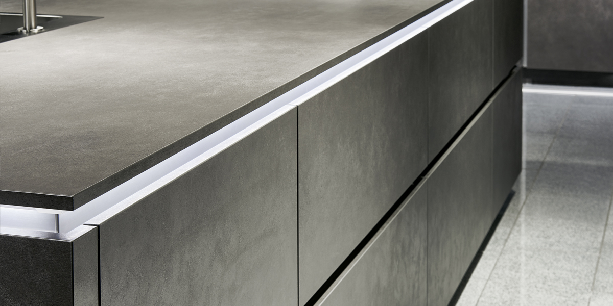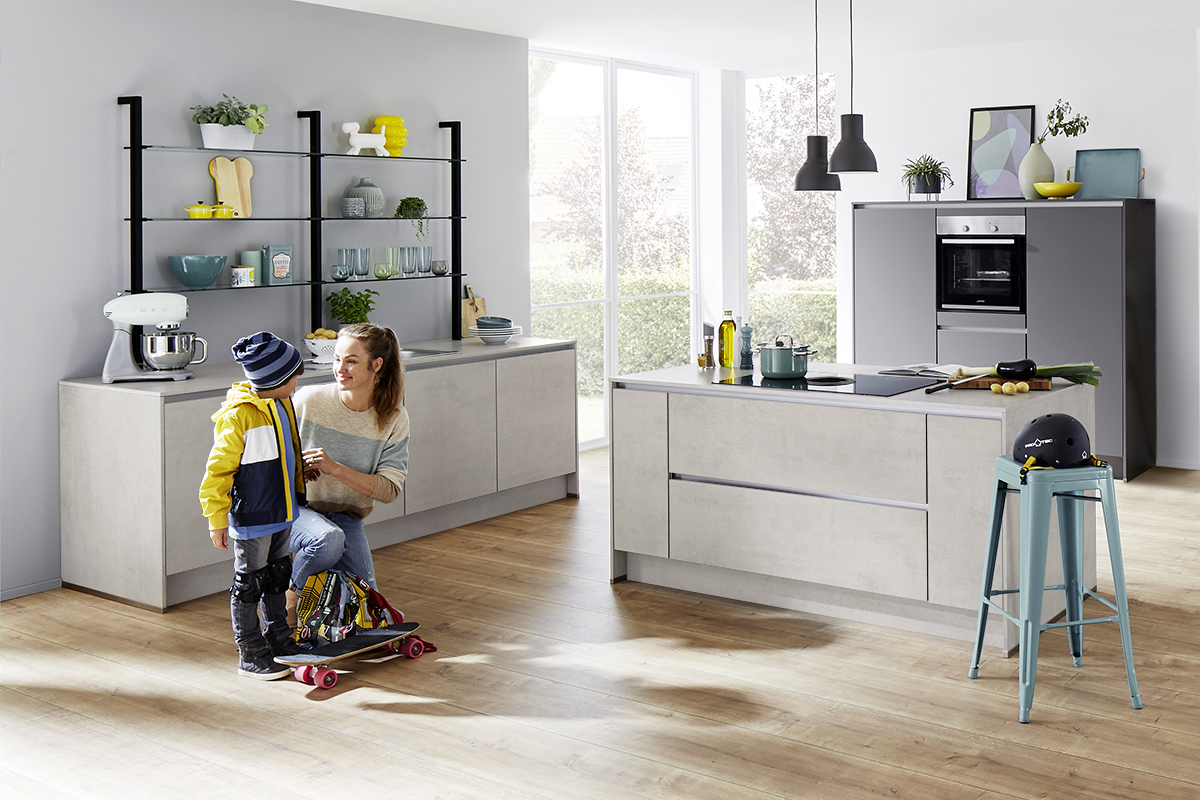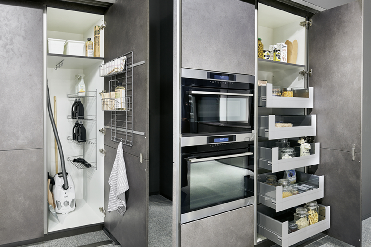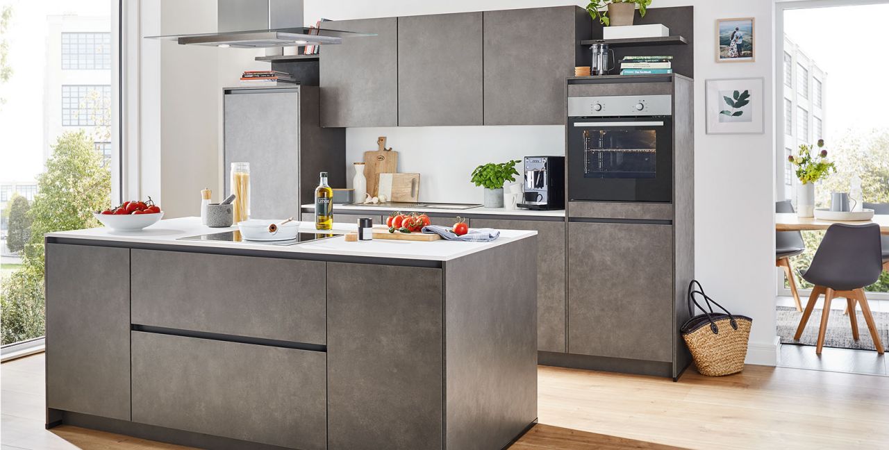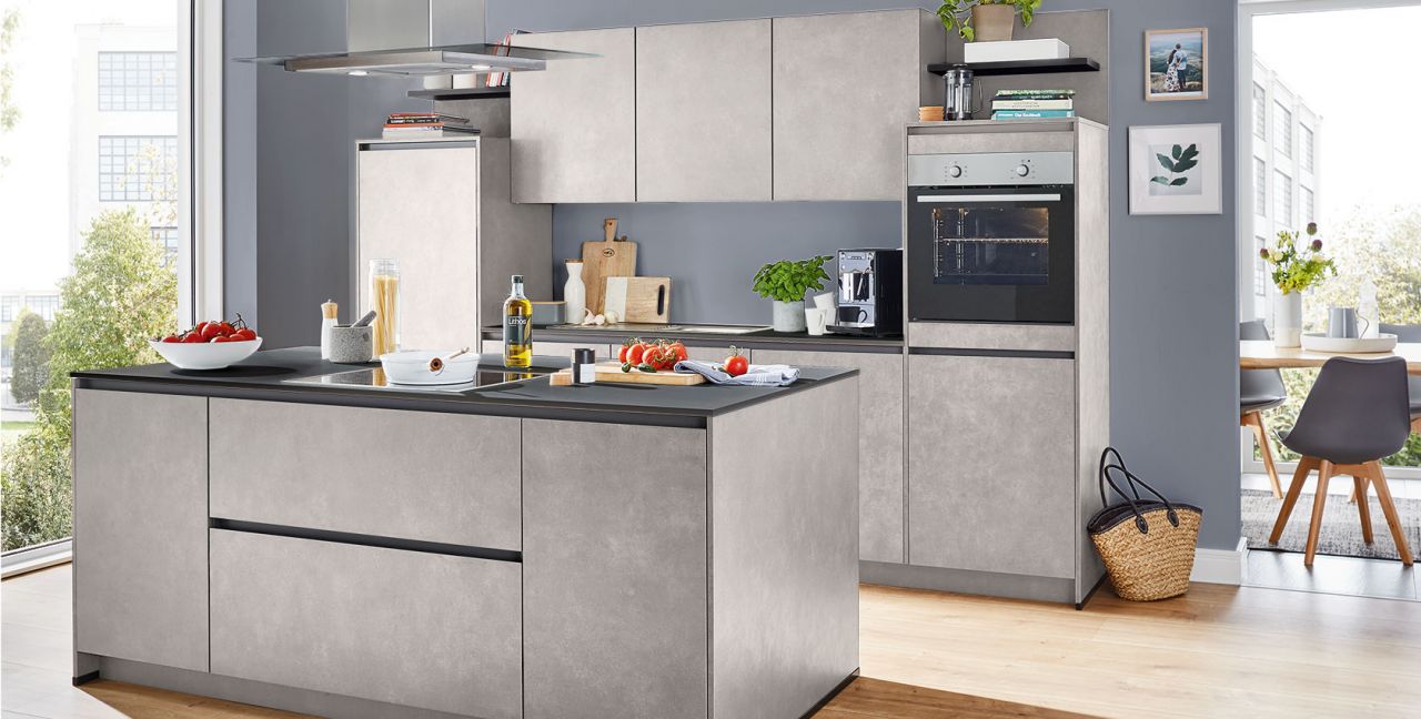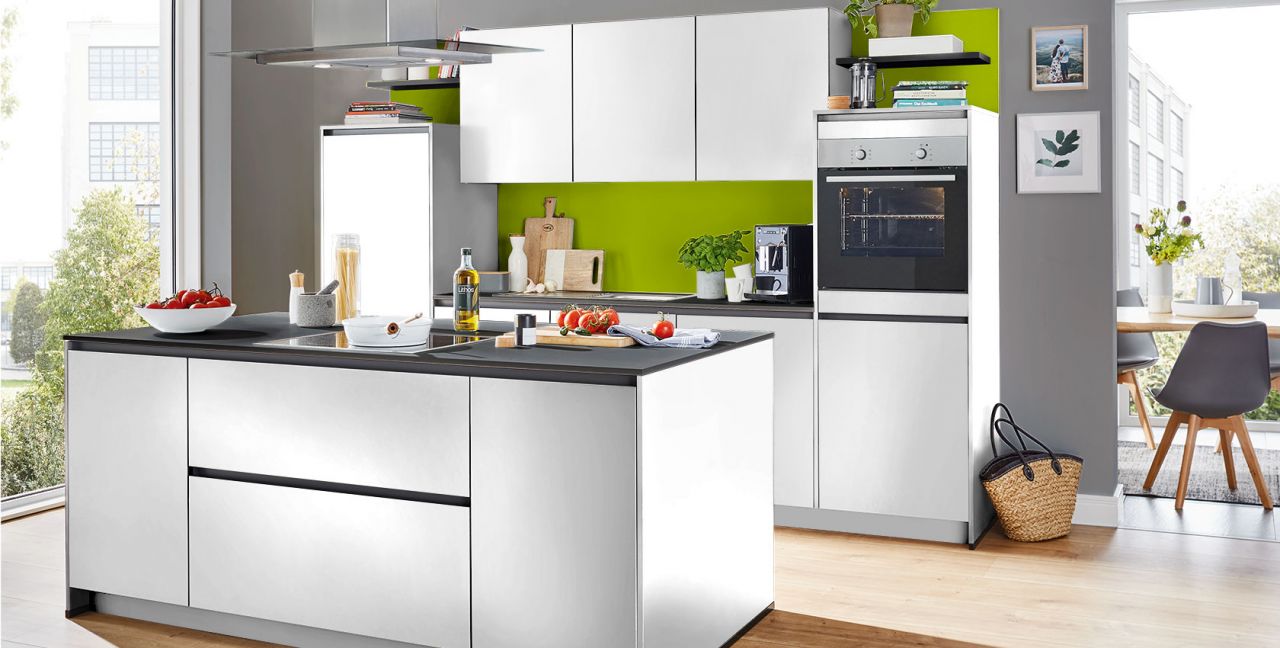 Inclusief RVS-inbouwoven Laurus LEB5 Energieklasse A, keramische kookplaat Laurus LCA600, eilandschouw RVS / glas Elica TRIBE INSEL-A Energieklasse A, koelkast Laurus LKG88E Energieklasse E, RVS-inbouwspoelbak Rodi Okio Line 85 Deep, XL-kasten, onderkast met uittrekinterieur, wandborden.